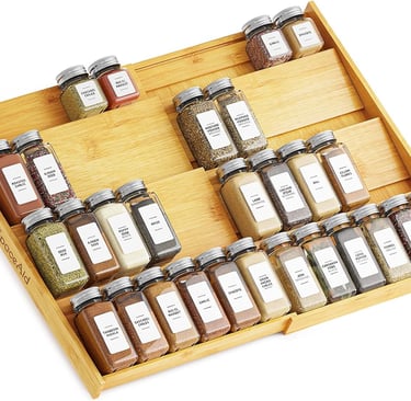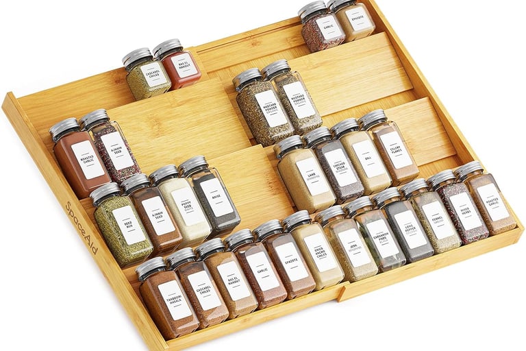 Laying spice bottles flat in a drawer with these angled organizers means I can see every label. No more buying duplicate spices.