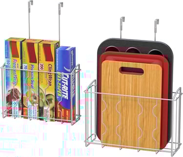 Hangs on the inside of cabinet doors to store lids, cutting boards, or aluminum foil.