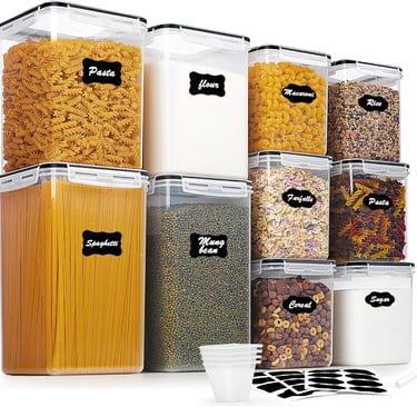 Transfer flour, sugar, rice, pasta, and cereal into these stackable containers.