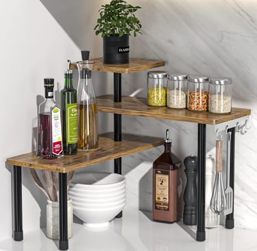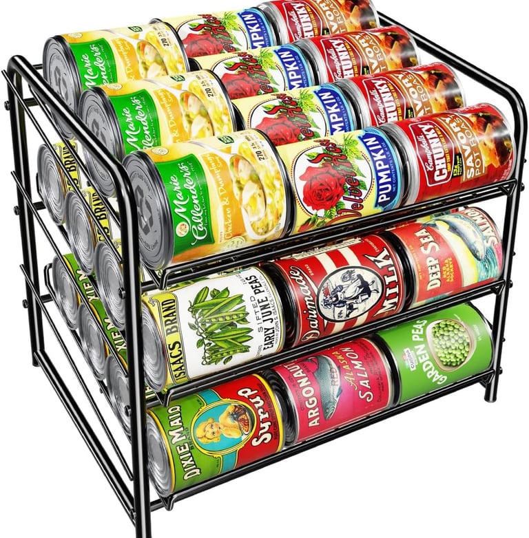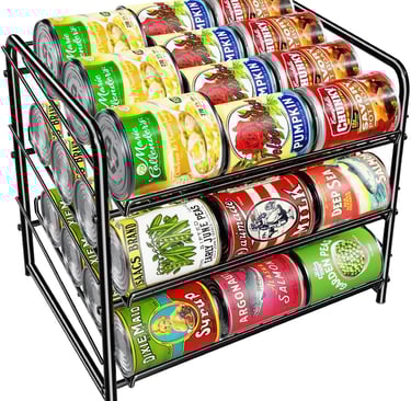 Creates tiered levels in cabinets so you can see every can. No more buying duplicates because you couldn't see what you owned.