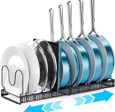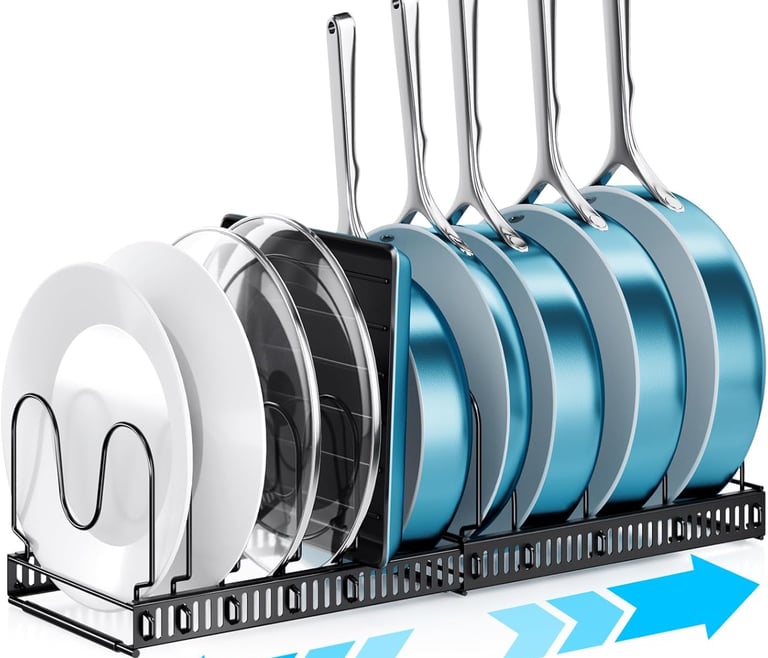 These expandable trays organize pots, pans, and lids vertically in deep drawers. Game changer for lower cabinets.